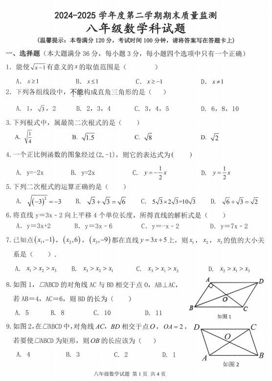 海南省临高县2024-2025学年下学期期末质量监测八年级数学试题