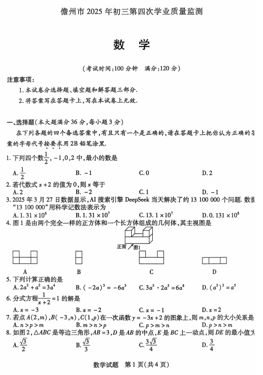 2025年海南省儋州市九年级第四次学业质量检测数学试题