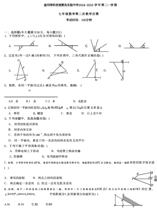 海南省三亚市崖州湾科技城寰岛实验中学2024-2025学年下学期七年级第二学期月考数学试卷