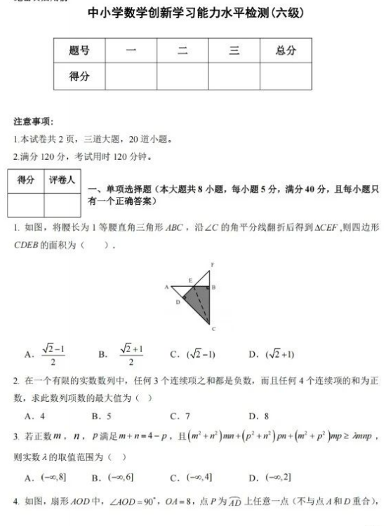 2024年12月山东省中小学数学创新学习能力水平检测活动六级(+九年级)数学试题
