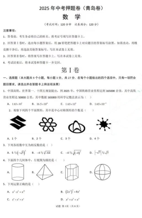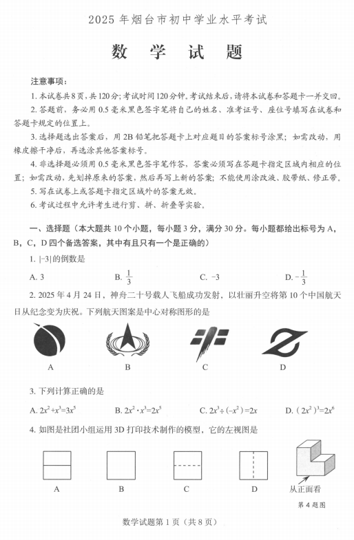 2025年山东省烟台市中考真题数学试题