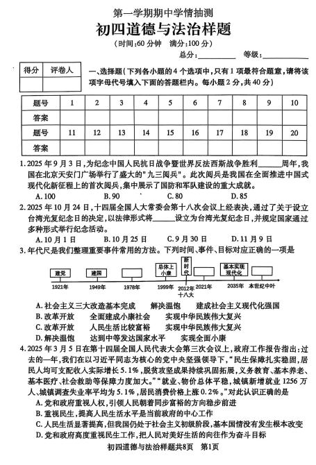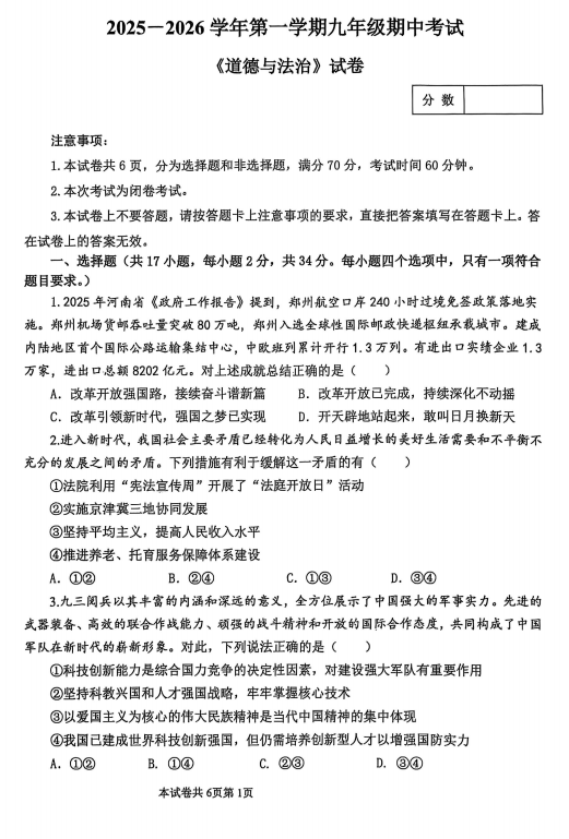 河北省沧州市第十四中学2025-2026学年上学期七年级历史第二次月考试卷
