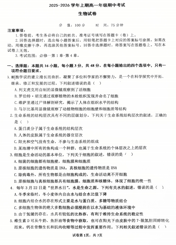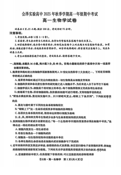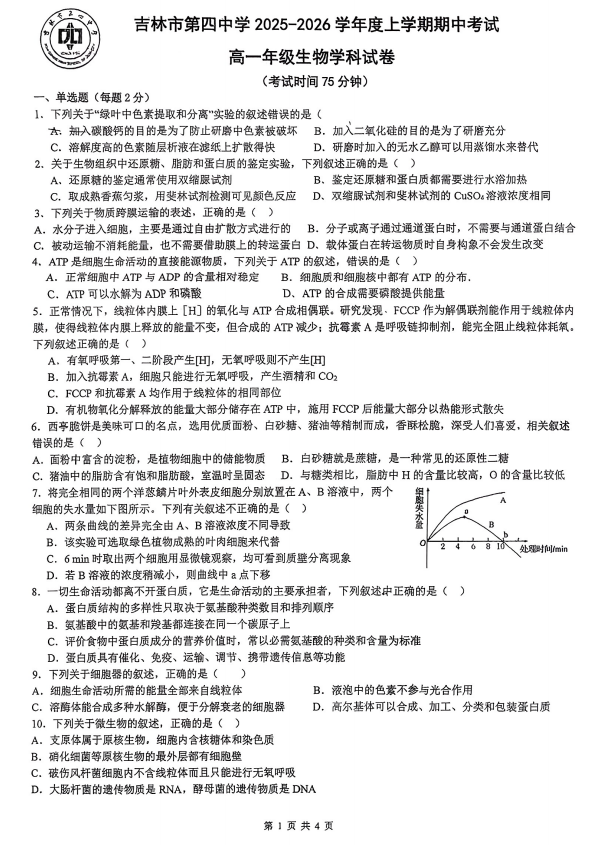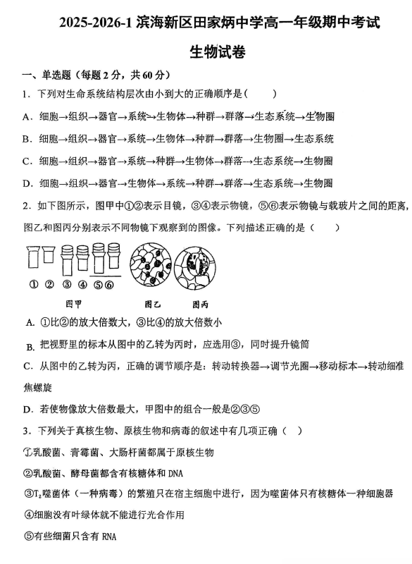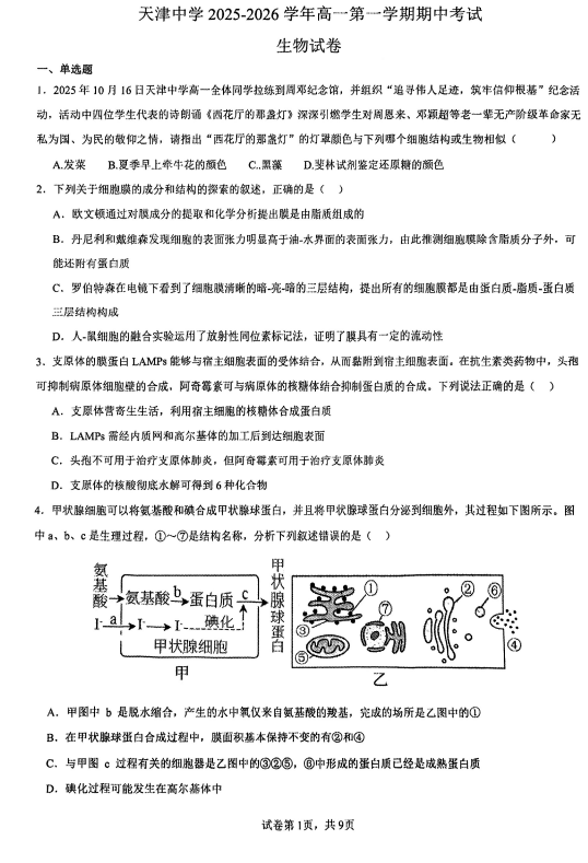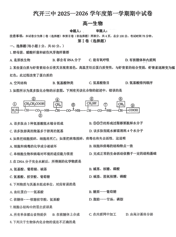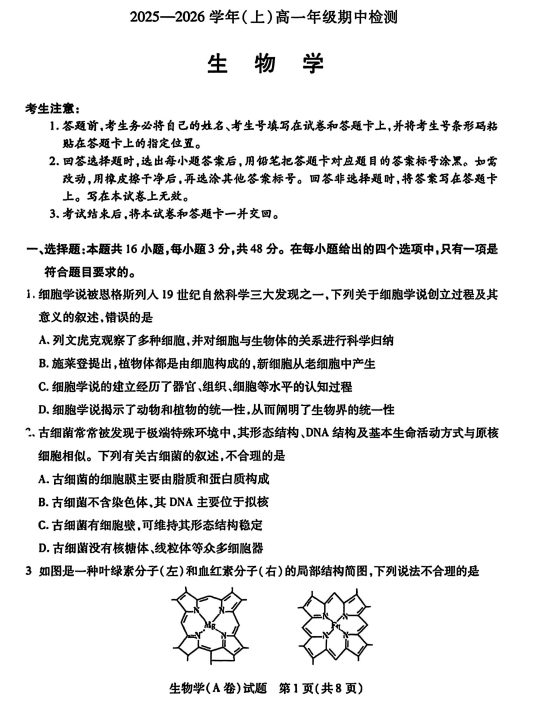 河北省衡水市泰华中学2025-2026学年高三上学期期中综合素质评价生物试卷