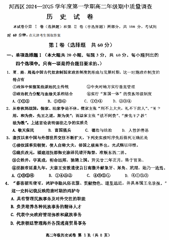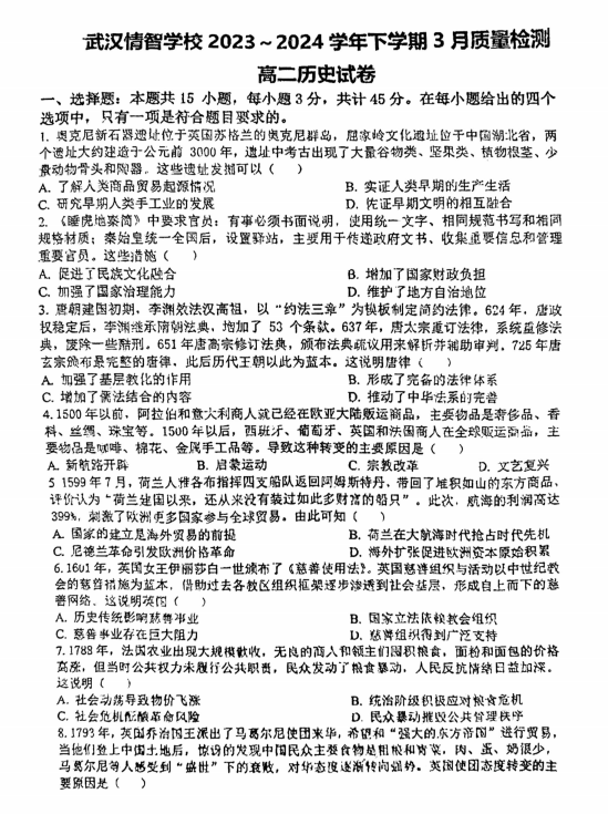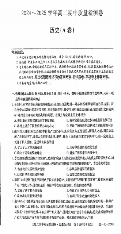 2025届河北省重点高中高三下学期质量检测(二)历史试题