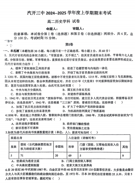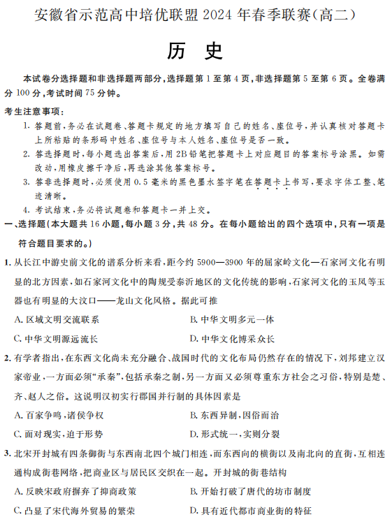 2025届河南省鹤壁市高三下学期第一次模拟考试历史试卷