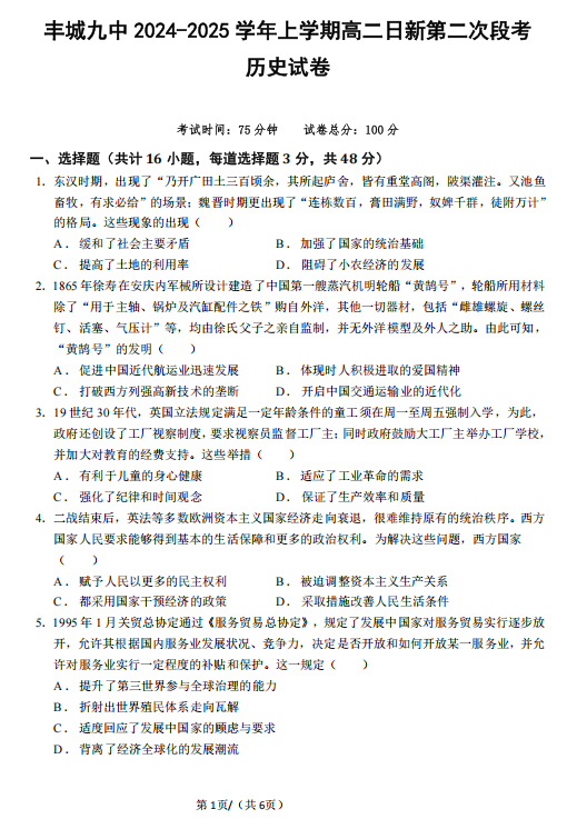 2025届江西省赣州市十八县(市、区)二十五校期中联考暨吉安市高三下学期一模历史试题