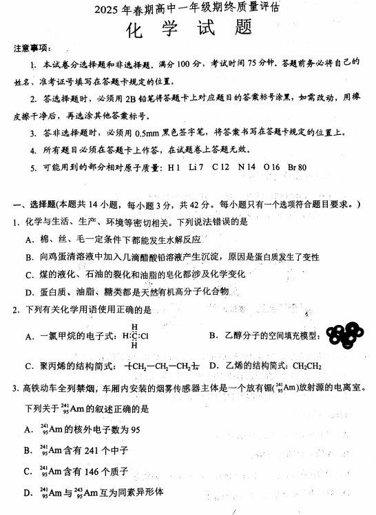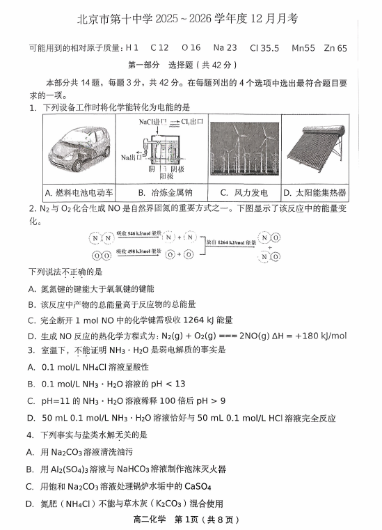 河北唐山市迁安市2025-2026学年高三上学期第二次诊断考试化学试题