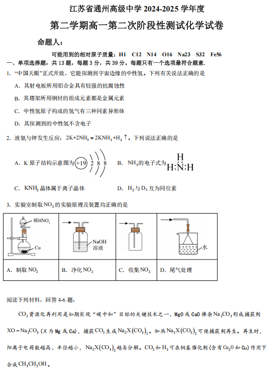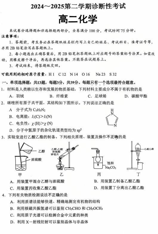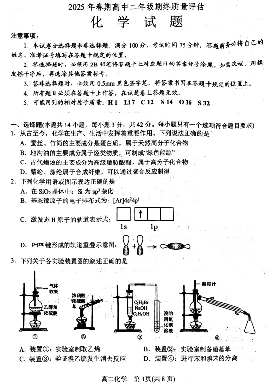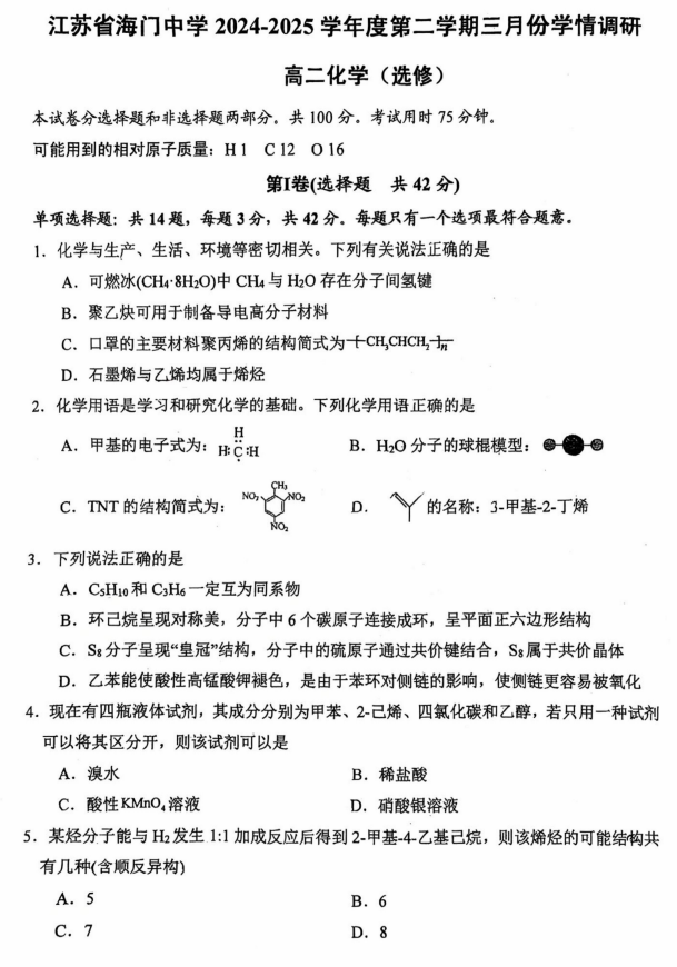 吉林省长春市第二实验中学2025-2026学年高三上学期化学第一次周测