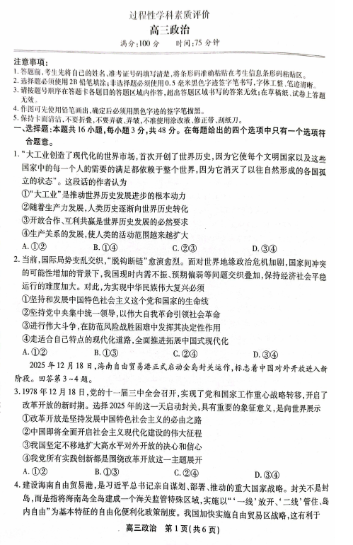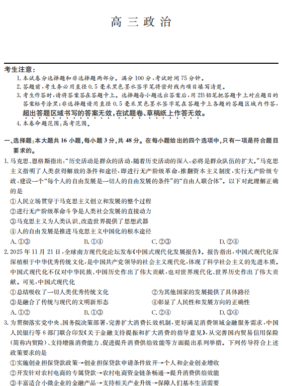 广西河池市凤山县高级中学等校2025-2026学年高三上学期期末学业水平质量检测政治试题