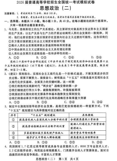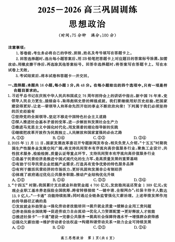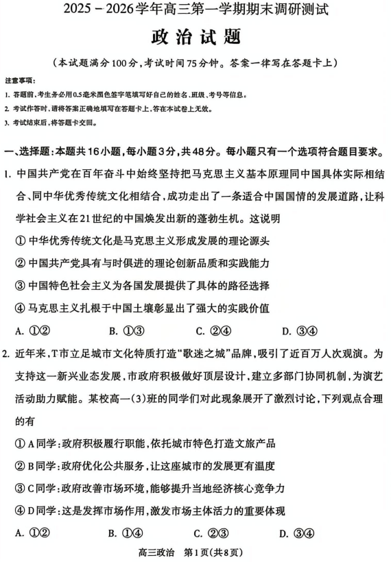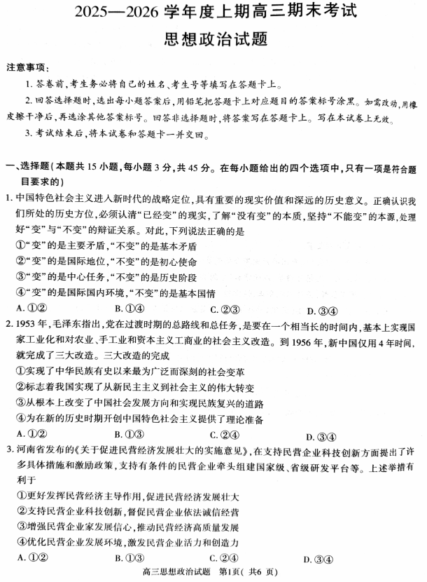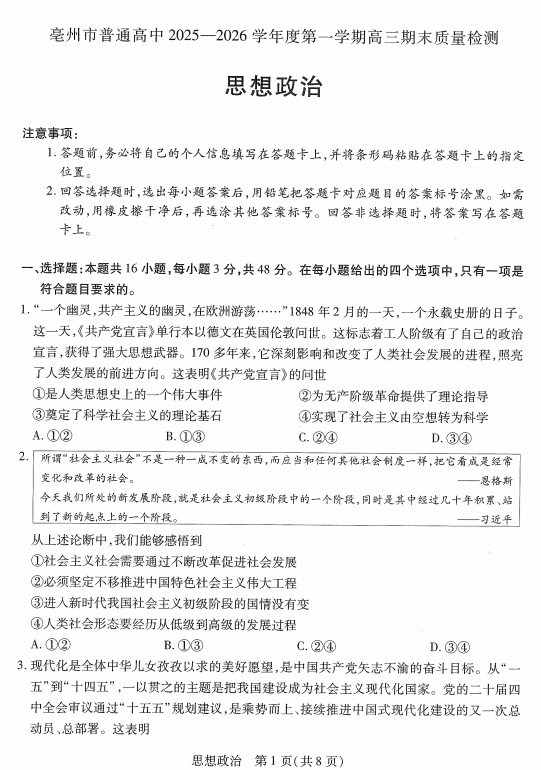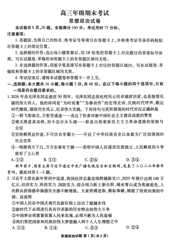 山东菏泽市2025-2026学年高三上学期2月期末考试政治试题(B)