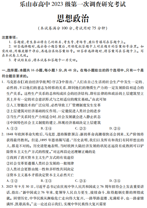河北冀州中学2025-2026学年高三上学期9月旬考政治试题