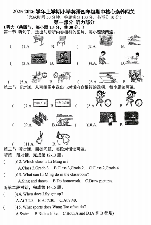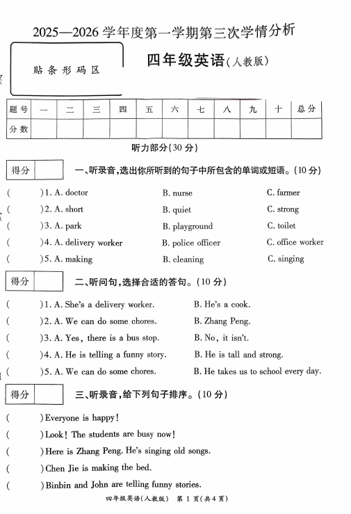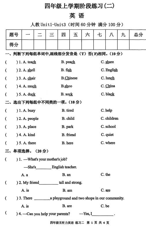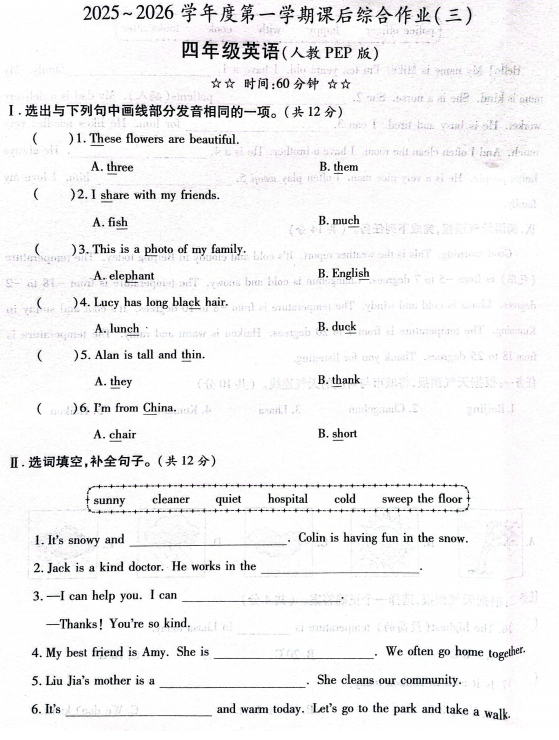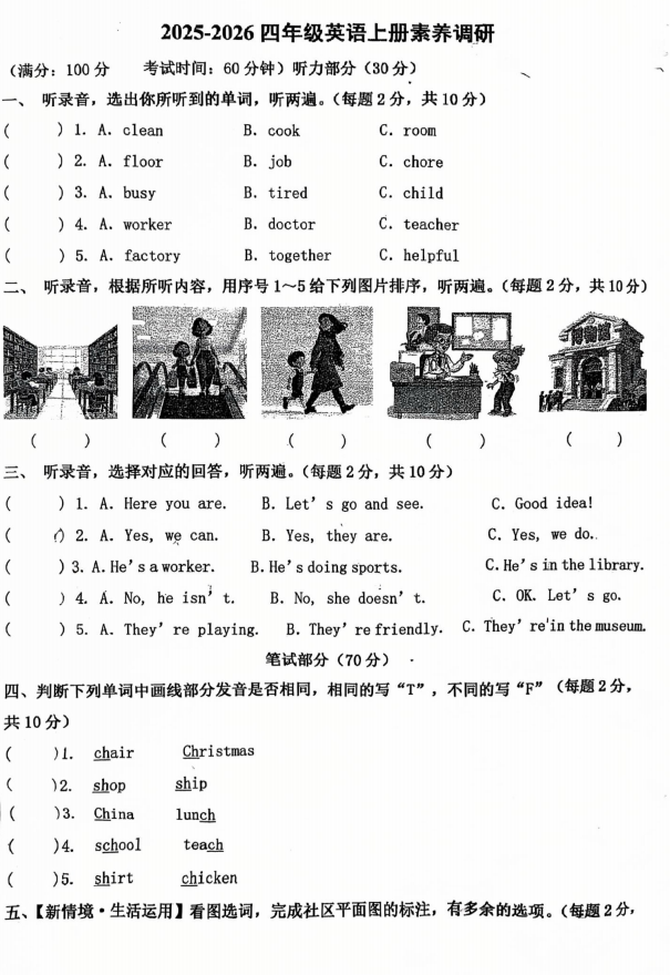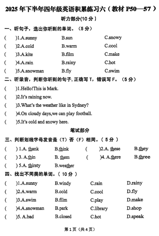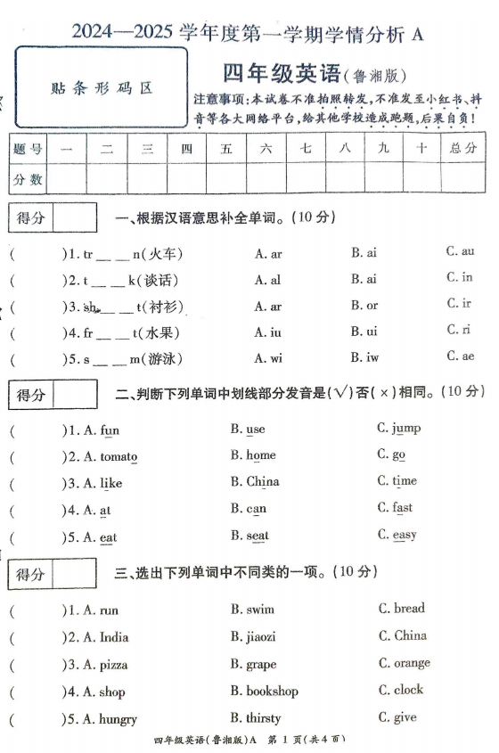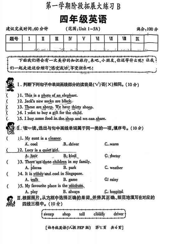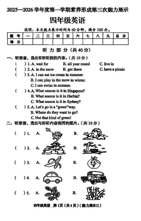 四年级英语真题