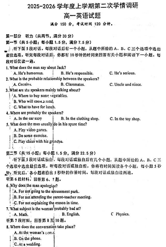 新疆乌鲁木齐市第十中学2025-2026学年高三上学期第二次月考英语试题