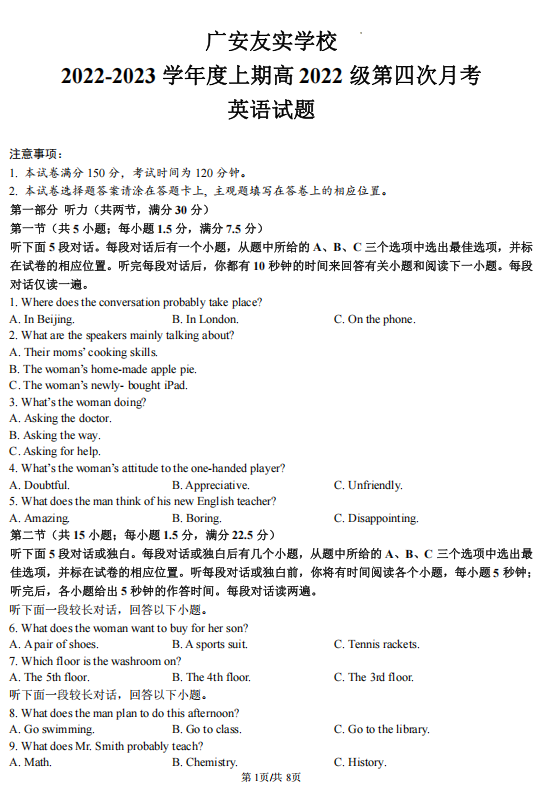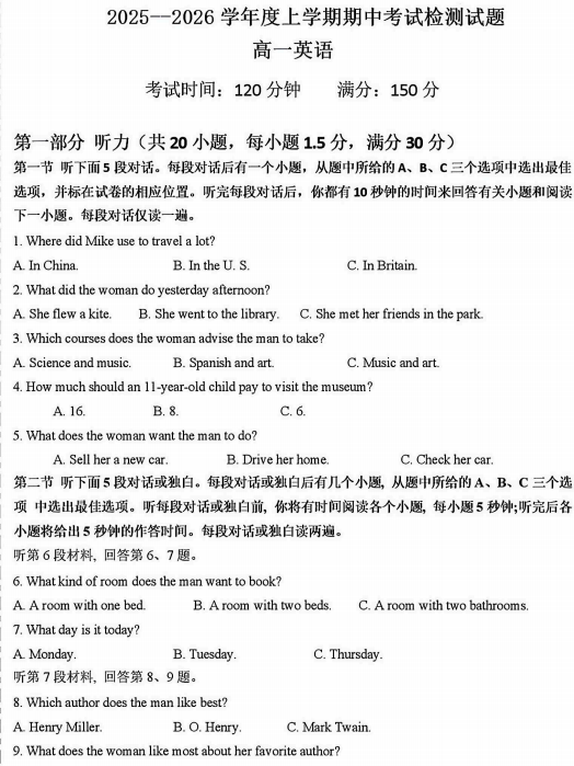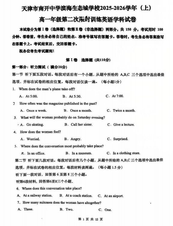 天津市第八中学2025-2026学年高三上学期第一次月考英语试卷