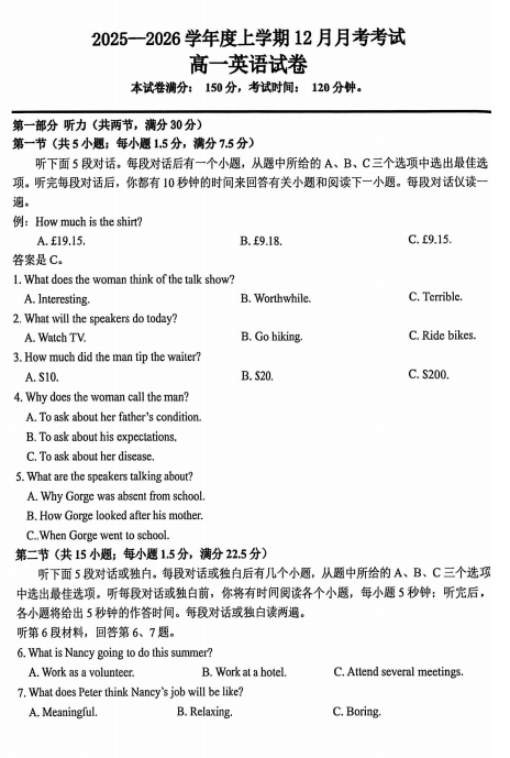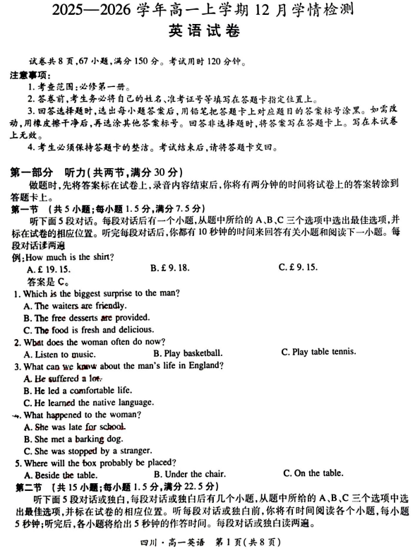 河北省衡水市冀州中学2025-2026学年高三上学期12月月考英语试题