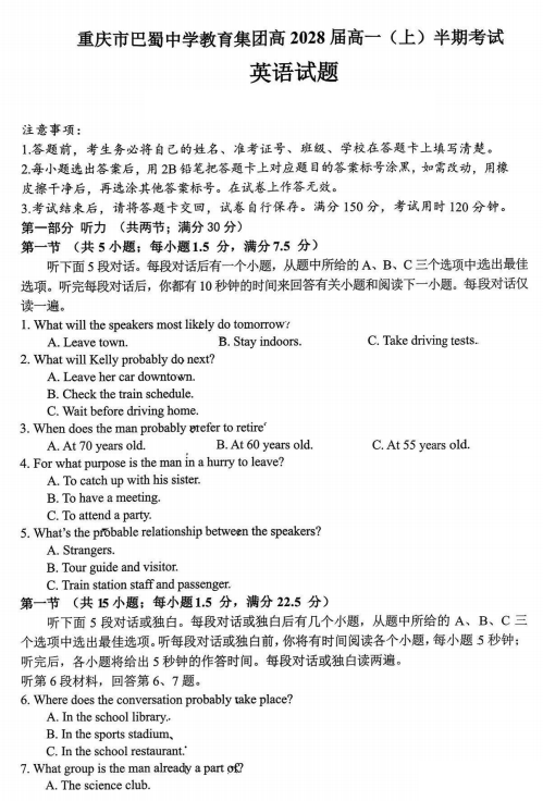 重庆市第一中学校2025-2026学年高三上学期12月周考英语试题