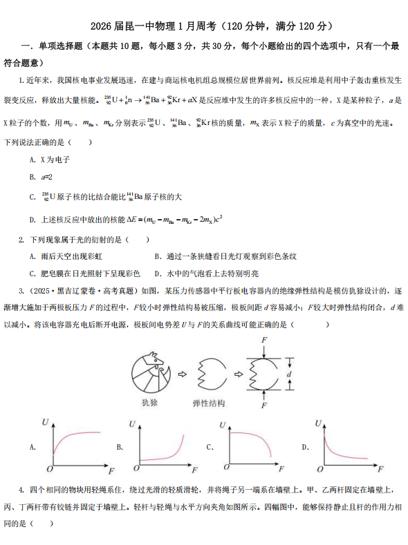 2026届江苏省徐州市第三中学高三上学期一模物理试题