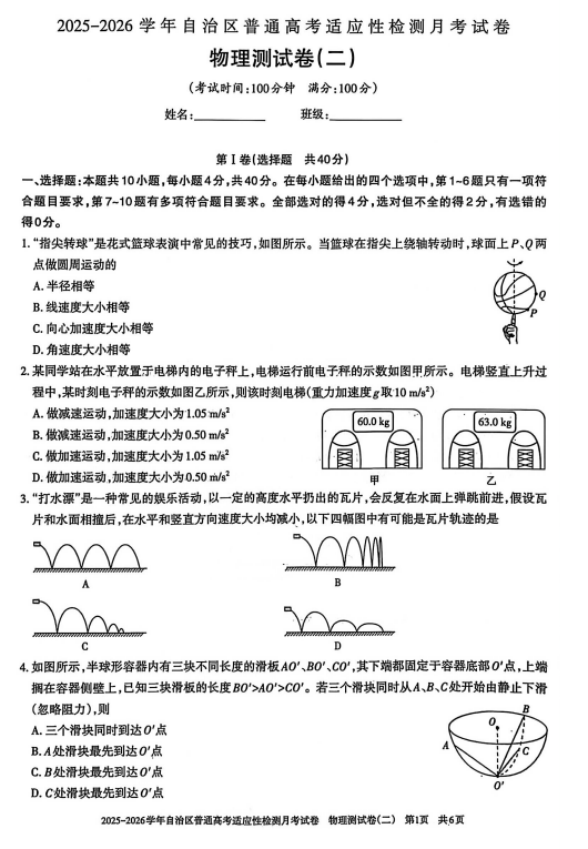 天津市南仓中学2025-2026学年高三上学期第二次月考物理试卷